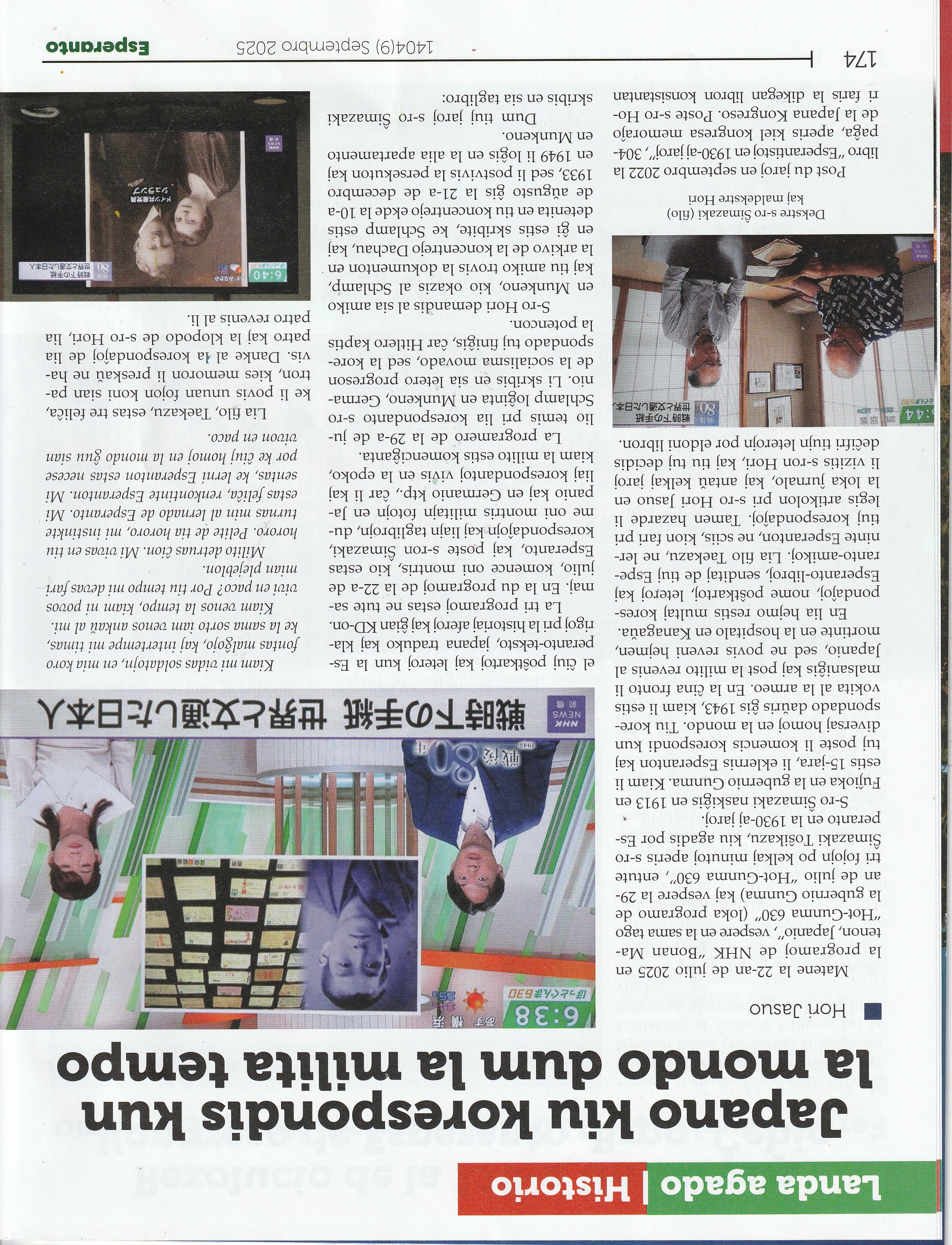 En julio 3 fojojn kaj en septembro unu fojon mi aperis en la plej prestiĝa TV, NHK, parolante pri s-ro Ŝimazaki Toikazu, kiu agadis en la 1930-aj jaroj. Mi verkis artikolon pri tio kaj ĝi aperis en la septembra numero de la organo de UEA “Esperanto”. Mi alkroĉas la paĝon. Bonvolulegi ĝin.