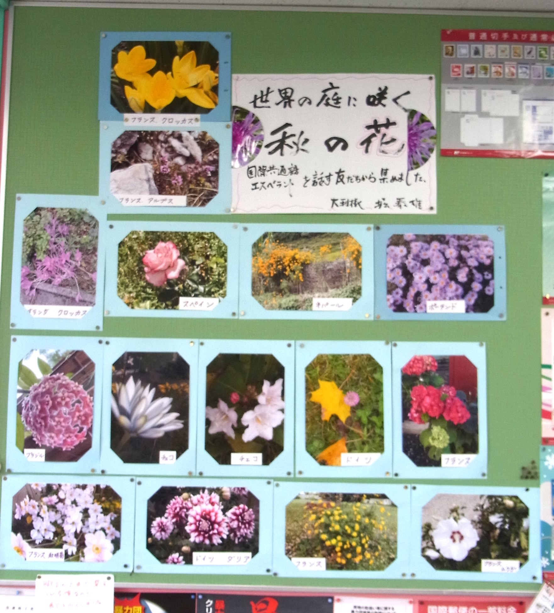 1. En la poŝtoficejo Kamiŝinden en mia urbo Maebaŝi mi montris la fotojn el la mondo temantajn pri floroj en ĝardenoj.